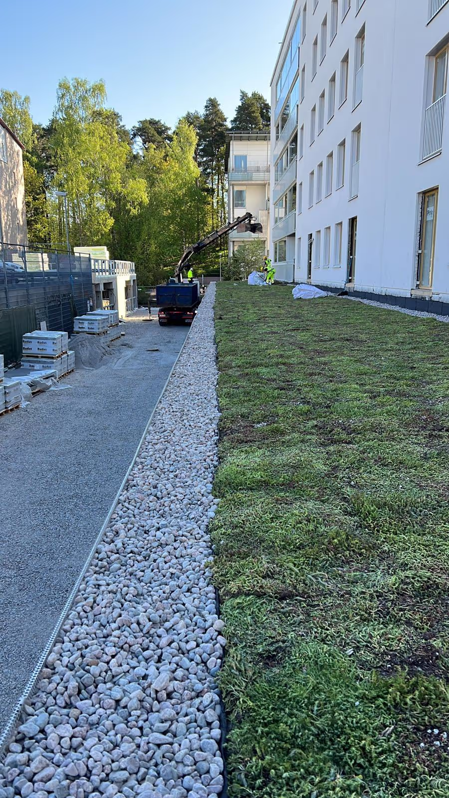 Pieni oleskeluterassi. Reunakivat ja terassi asennettu. Tulevat työvaiheet istutusaltaan viimeistely, multien levitys ja kasvien istutus.
